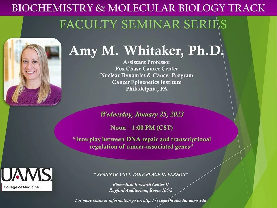 Amy presented a seminar at University of Arkansas for Medical Sciences (UAMS) titled "Interplay between DNA repair and transcriptional regulation of cancer-associated genes”.